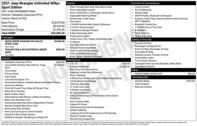 Designed with the outdoor enthusiast in mind, this Wrangler Unlimited Willys comes equipped with a host of features to enhance your driving experience. The Trailer Tow & HD Electrical Group provides the necessary towing capabilities, while the Black 3-Piece Hard Top offers year-round protection and versatility. The Willys-specific design elements, such as the Willys Hood Decal and Wrangler Decal, add a distinctive touch that sets this Wrangler apart from the crowd.