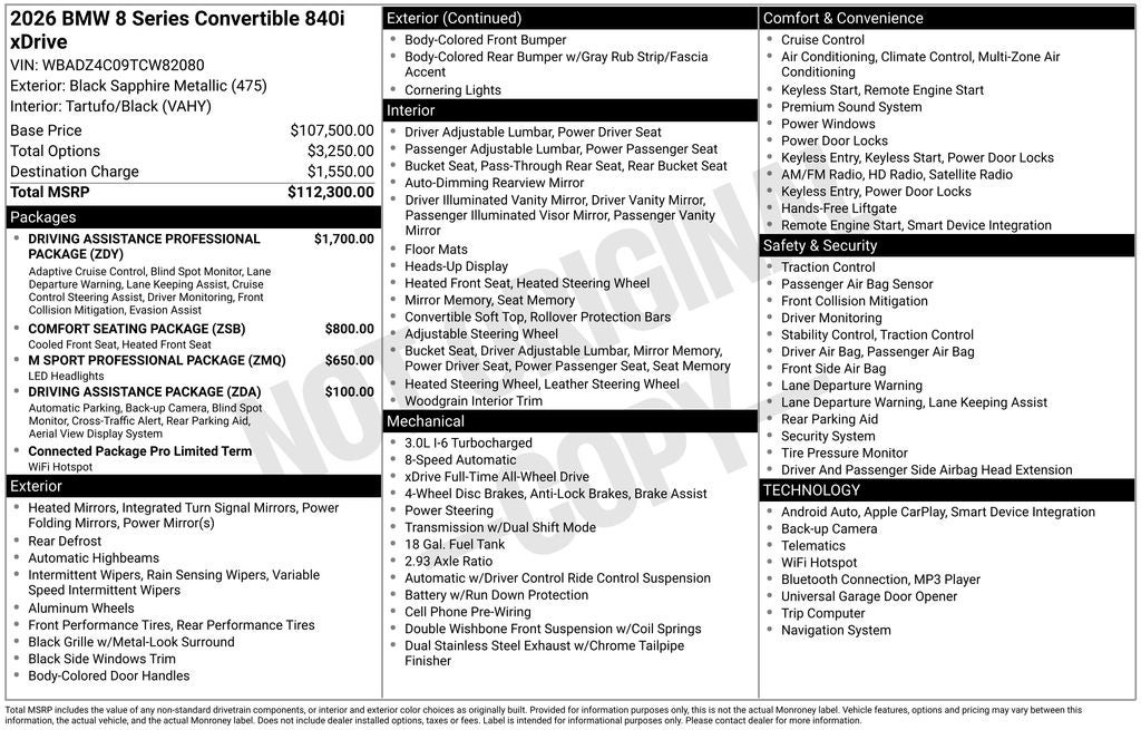 Equipped with a powerful 3.0L I6 DOHC 24V TwinPower Turbo engine and 8-Speed Automatic Sport transmission, this 840i delivers an exhilarating driving experience with an impressive 21 city and 29 highway MPG. The Driving Assistance Professional Package, Comfort Seating Package, and M Sport Professional Package further enhance your driving experience, providing features like Distance Control with Steering Assistant, Partial Automated Driving, Front Ventilated Seats, and M Sport Brakes with Black Calipers.